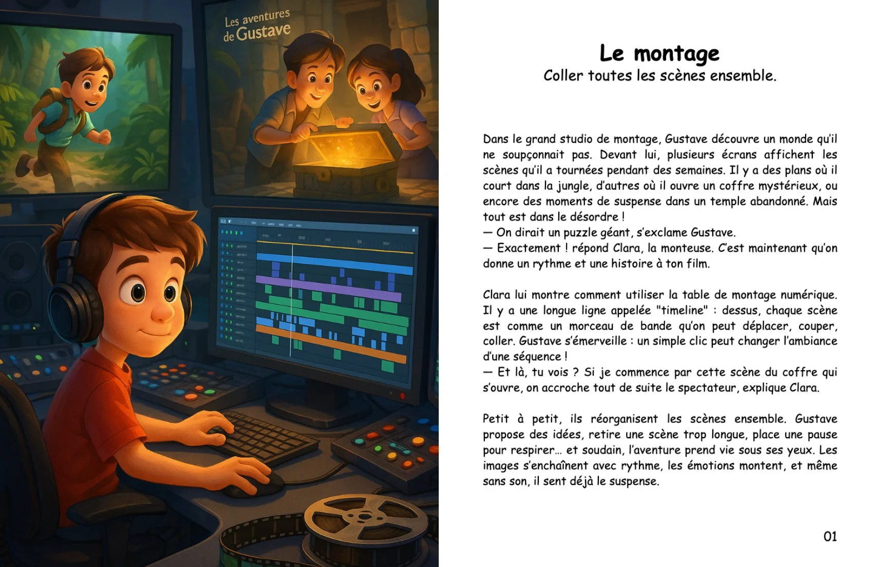 Dans ce second volume, il apprend à monter un film image par image, à créer la musique parfaite, à doubler les personnages, à ajouter les bruitages et même à dessiner l’affiche qui fera rêver petits et grands. De la salle de montage aux studios d’enregistrement, jusqu’au tapis rouge de l’avant première, Gustave explore tous les secrets qui transforment un tournage en un vrai film de cinéma.