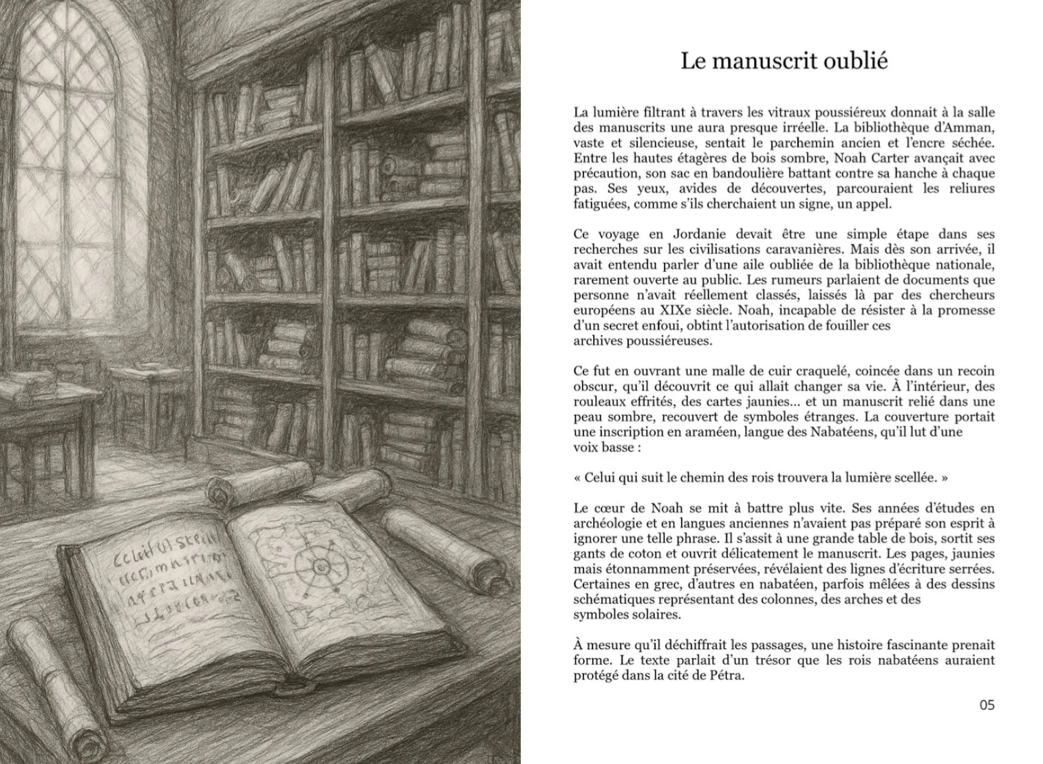 Lorsque Noah Carter découvre un manuscrit oublié à Amman, il ne sait pas encore qu’il s’apprête à pénétrer au cœur de l’une des énigmes les plus fascinantes du monde antique. Des tombeaux royaux aux marchés des caravanes, des gorges du Siq à l’ombre majestueuse du Monastère, chaque pas le rapproche d’un trésor… et d’une prophétie oubliée.