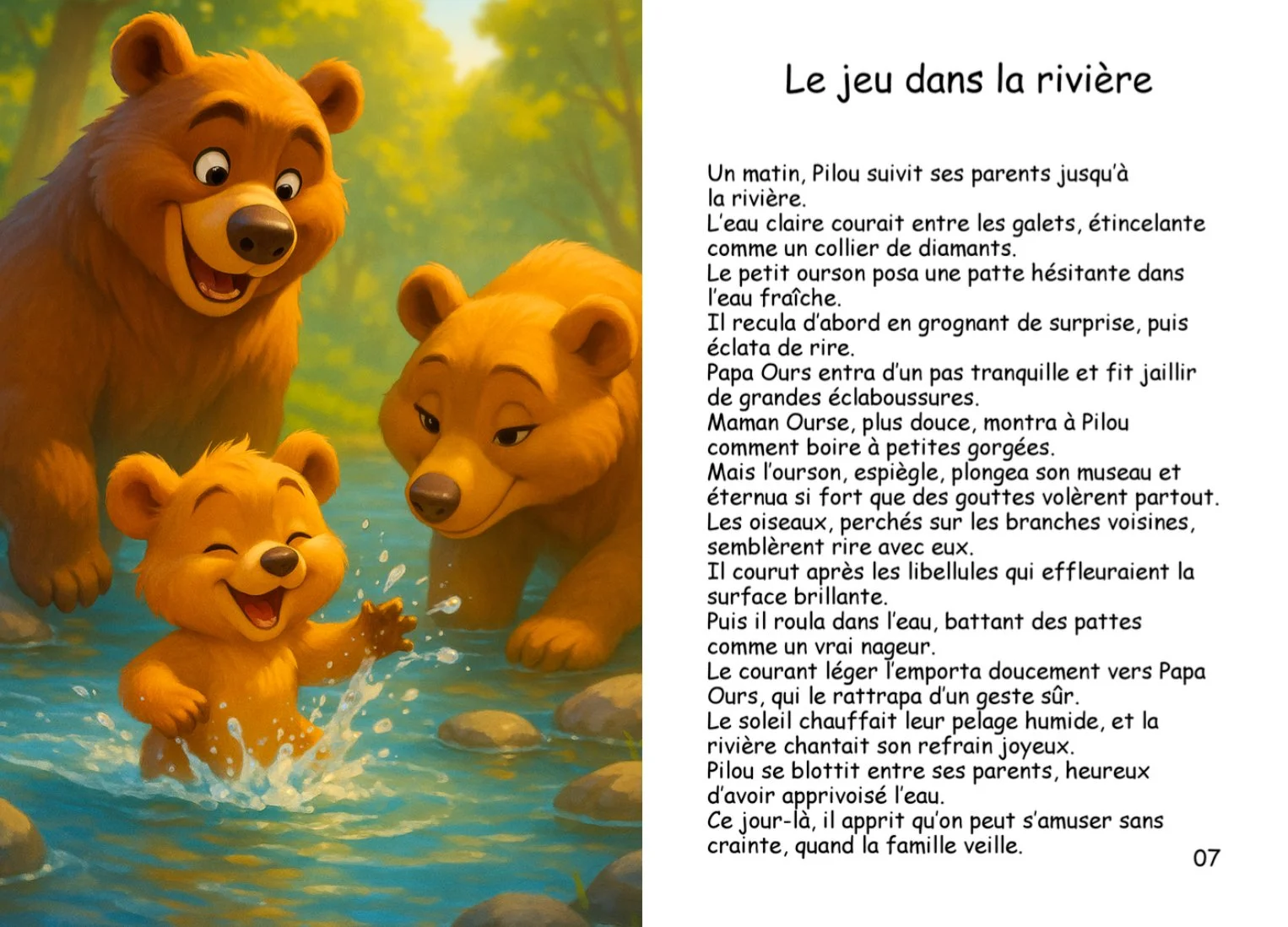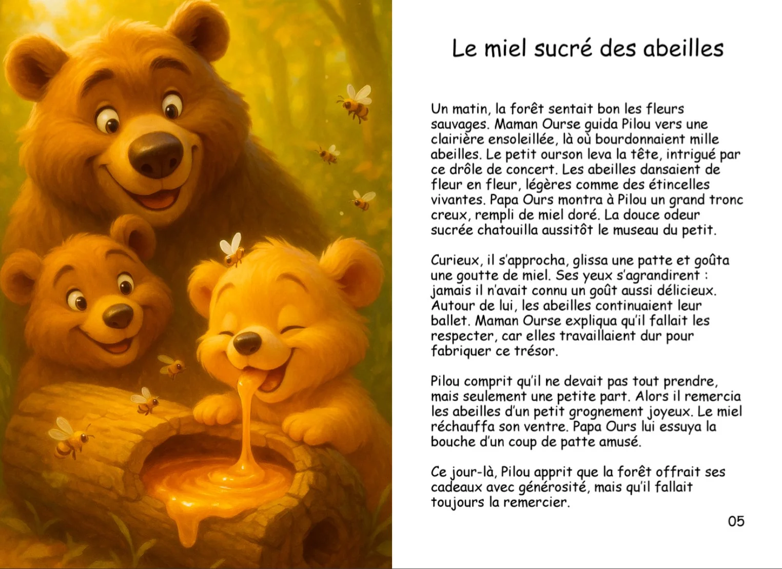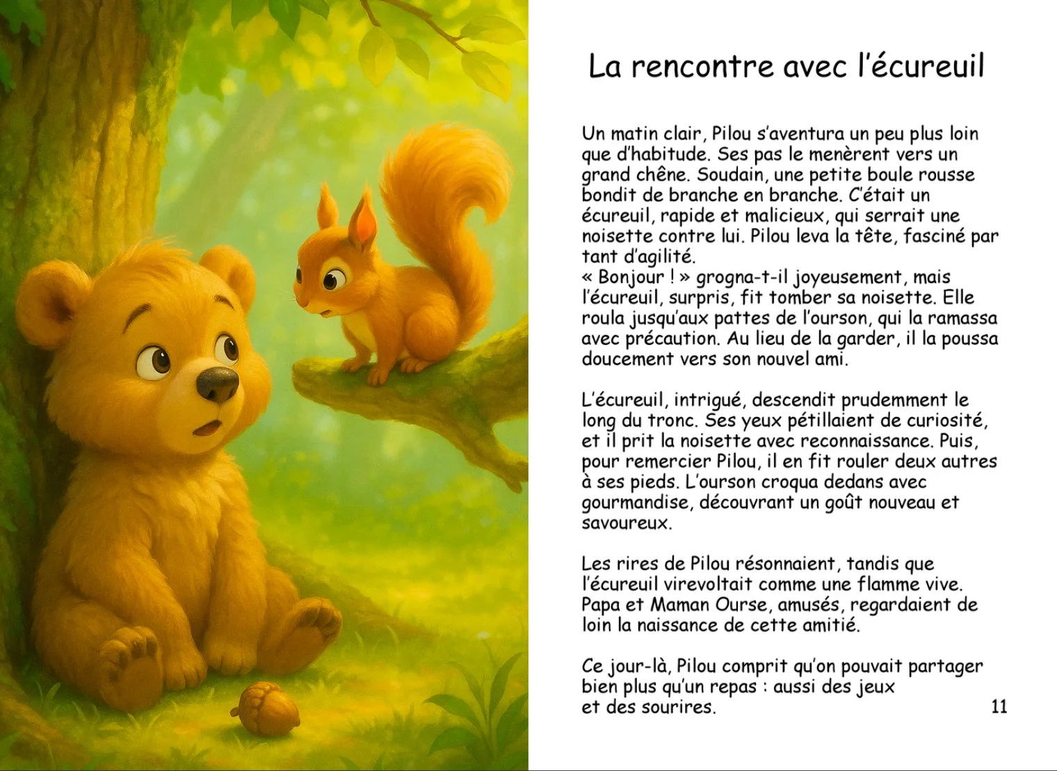 Au cœur de la grande forêt vit une famille douce et joyeuse : Papa Ours, Maman Ourse, et leur petit ourson curieux, Pilou. Chaque jour est une nouvelle découverte : les premiers pas dans la clairière, la cueillette des baies rouges, la danse des papillons ou encore la magie des lucioles au crépuscule.