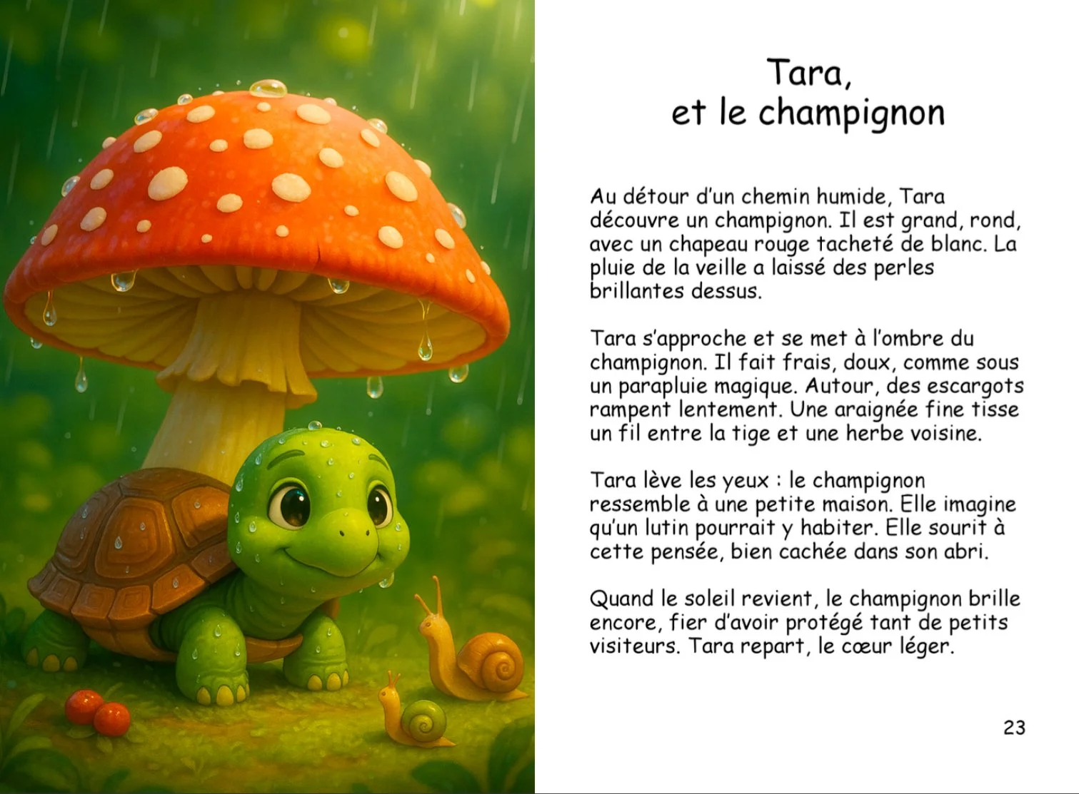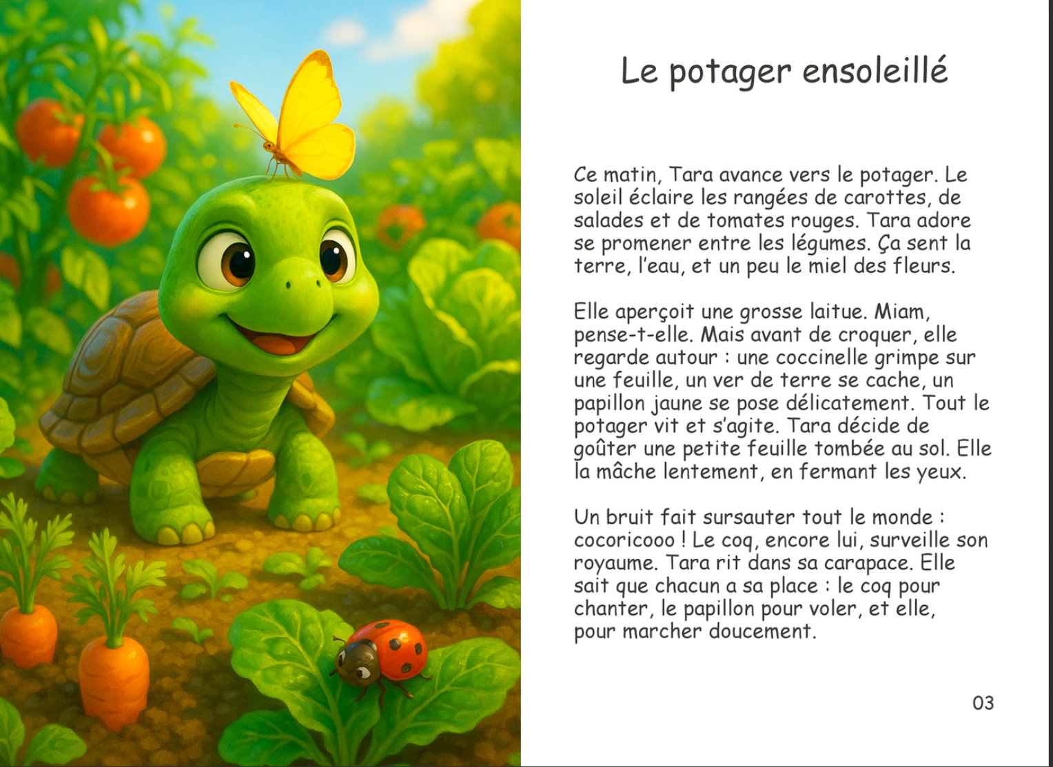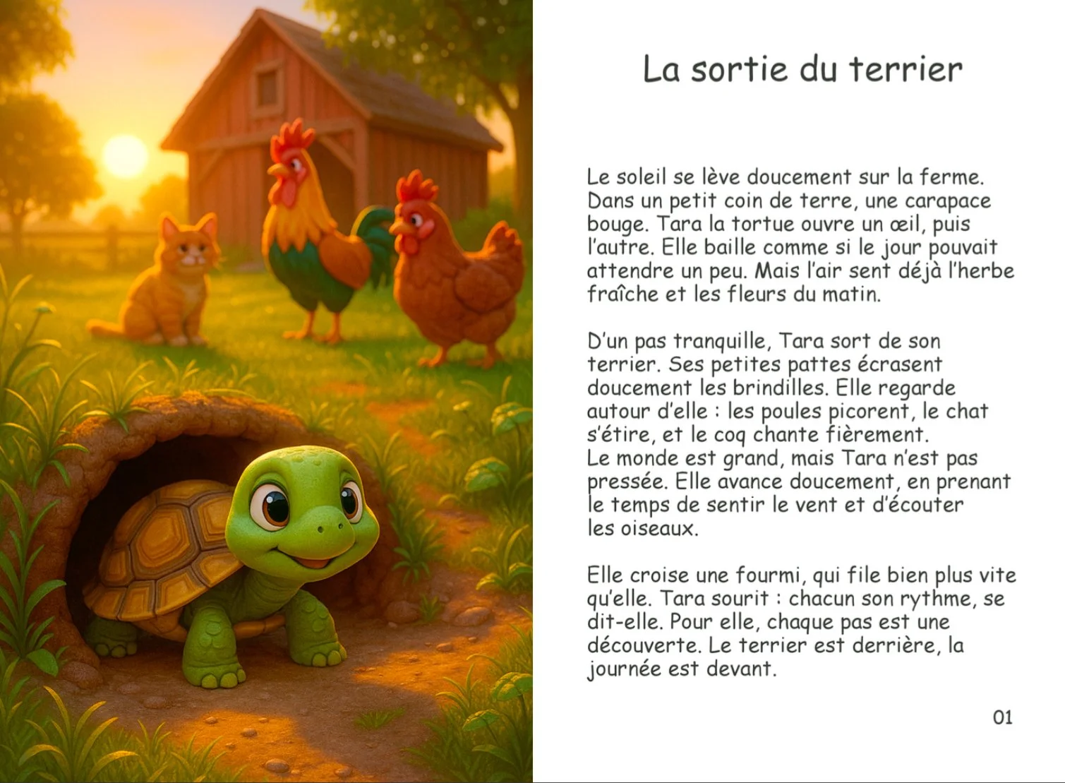 Dans la forêt et à la ferme vit Tara, une petite tortue curieuse et paisible. Pas à pas, elle découvre le monde qui l’entoure : les rencontres, les surprises et les merveilles de la nature.