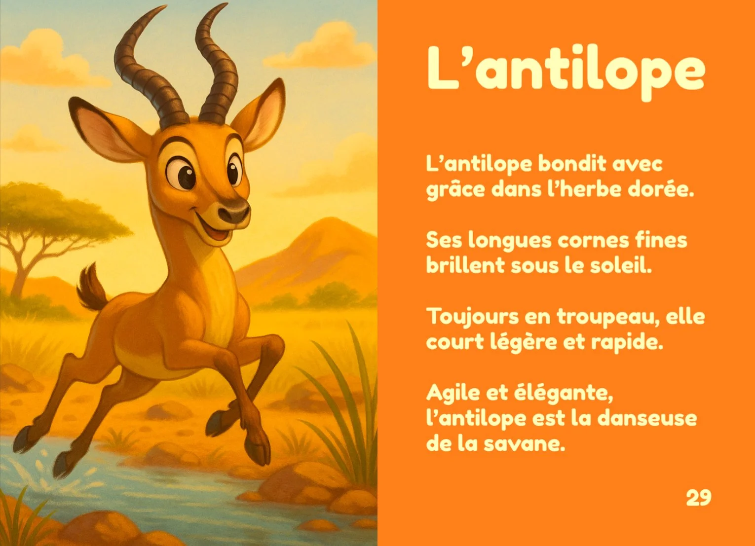 Un lionceau qui rugit avec douceur, une mangouste maligne qui court partout, une antilope qui saute comme le vent…
